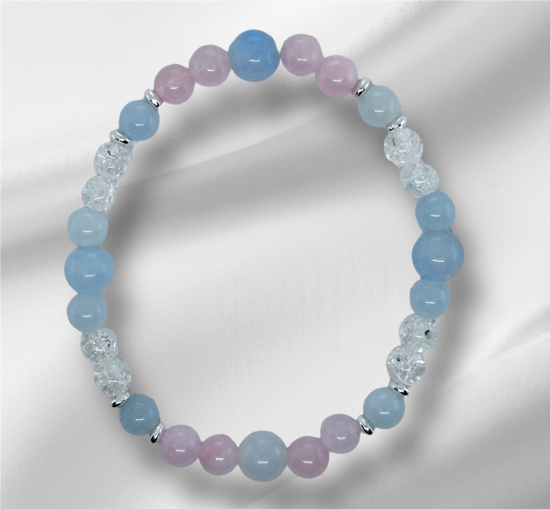 恋愛運を高めるパワーストーンブレスレット。アクアマリン、ローズクォーツ、クラッシュクォーツの3種類のパワーストーンが組み合わさり、恋愛運アップをサポートします。アクアマリンは愛の象徴として知られ、ローズクォーツは心を癒し、クラッシュクォーツはパワーを高めてくれます。