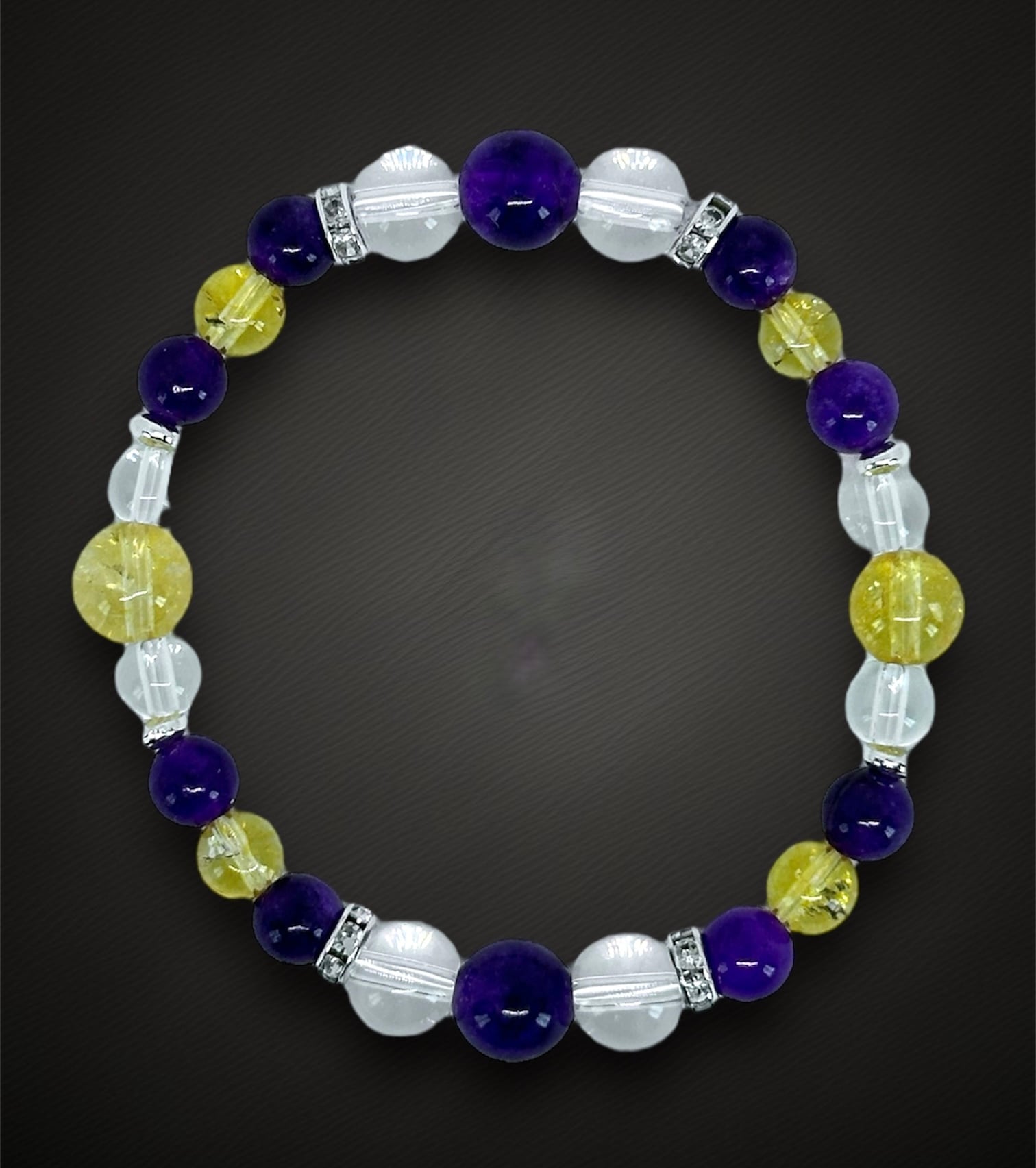 三種のパワーストーン、アメジスト、シトリン、クリアクォーツが贅沢に使用された金運パワーストーンブレスレット。アメジストは直感を高め、シトリンは豊かさと繁栄をもたらし、クリアクォーツは浄化力を持ち、ネガティブなエネルギーを取り除いてくれます。